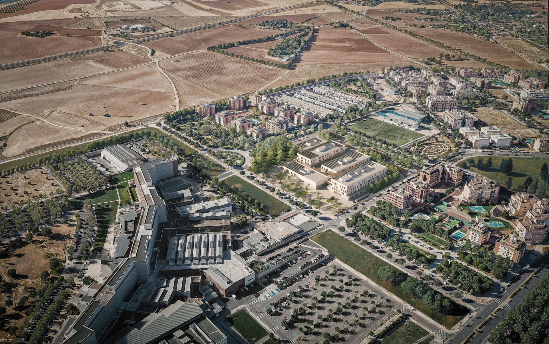 En términos compositivos, el Campus se adapta a la trama urbana y se integra de manera armoniosa en el entorno residencial de las manzanas adyacentes.