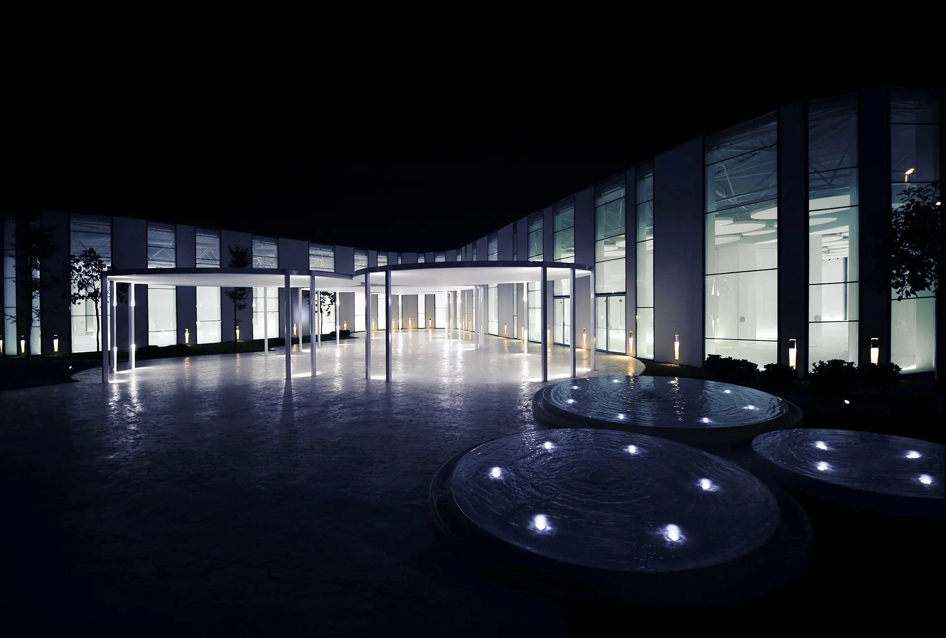 To the outside, are intended two large porches to hold outdoor events, and other space services, Taking advantage of the interaction between inside and outside, establishes a plant tradeoff; a garden that makes a green curtain that narrows the limits with masses of trees, carpets of green and white flowers; the sheets of water reinforce the accesses and bring order to the assembly.