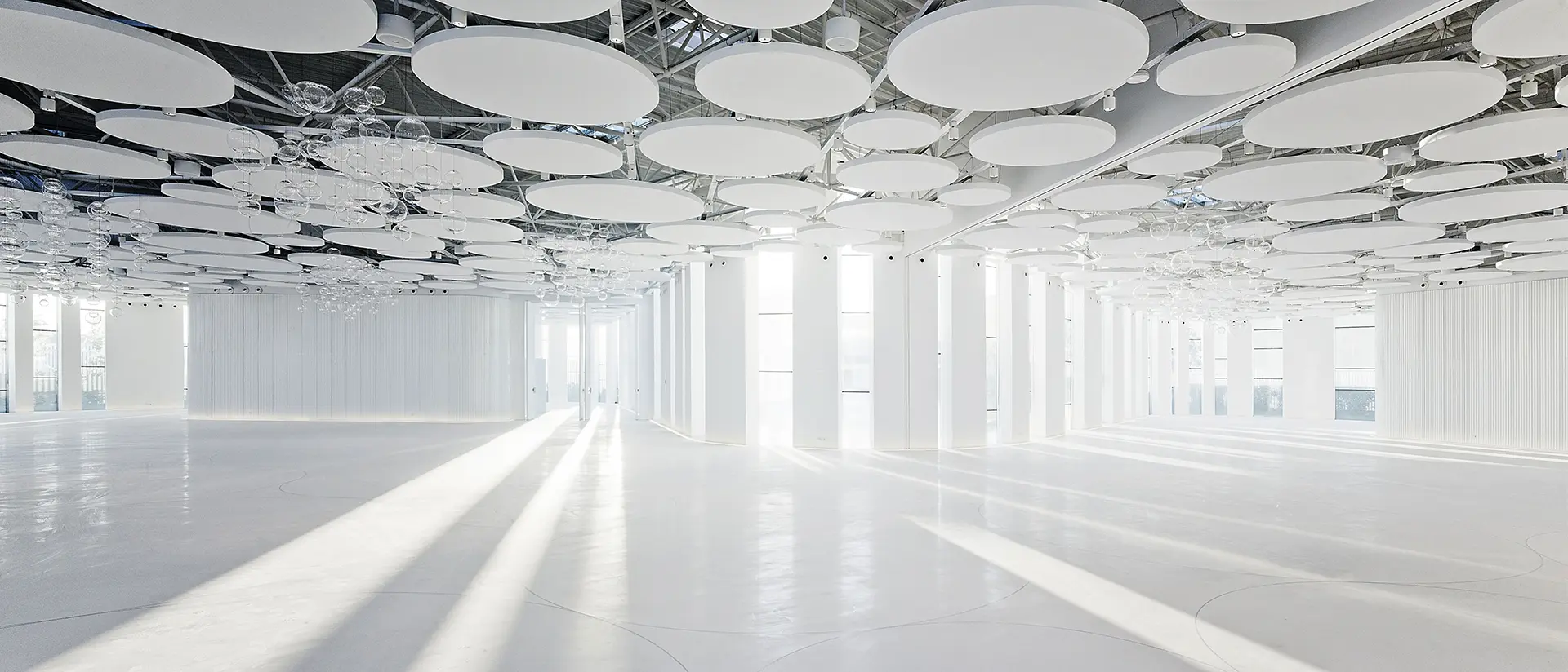 “The structural mesh allows lights of 22 meters without intermediate supports, and previewed through the circular plates that form the ceiling.”