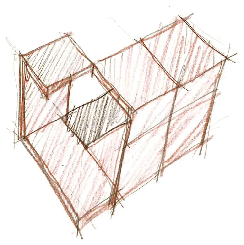 The space is defined by a sculptural structure composed of two arms converging at a point, creating an envelope that forms an open yet defined enclosure through the tension between solid and void.