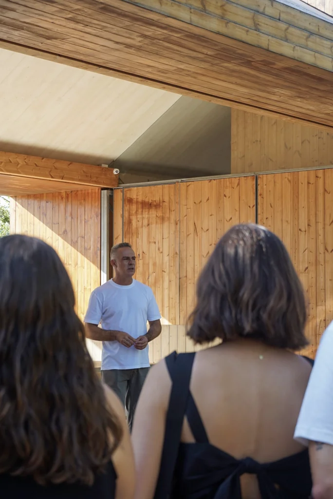 The itinerary began with a welcome at the Cottage, followed by a guided tour led by Ramón Esteve, who shared with attendees the conception of the project and its dialogue with the landscape. The complete tour allowed participants to understand the project's architecture not only as a built object but also as a sensory and landscape experience that unites nature, materiality and everyday life.