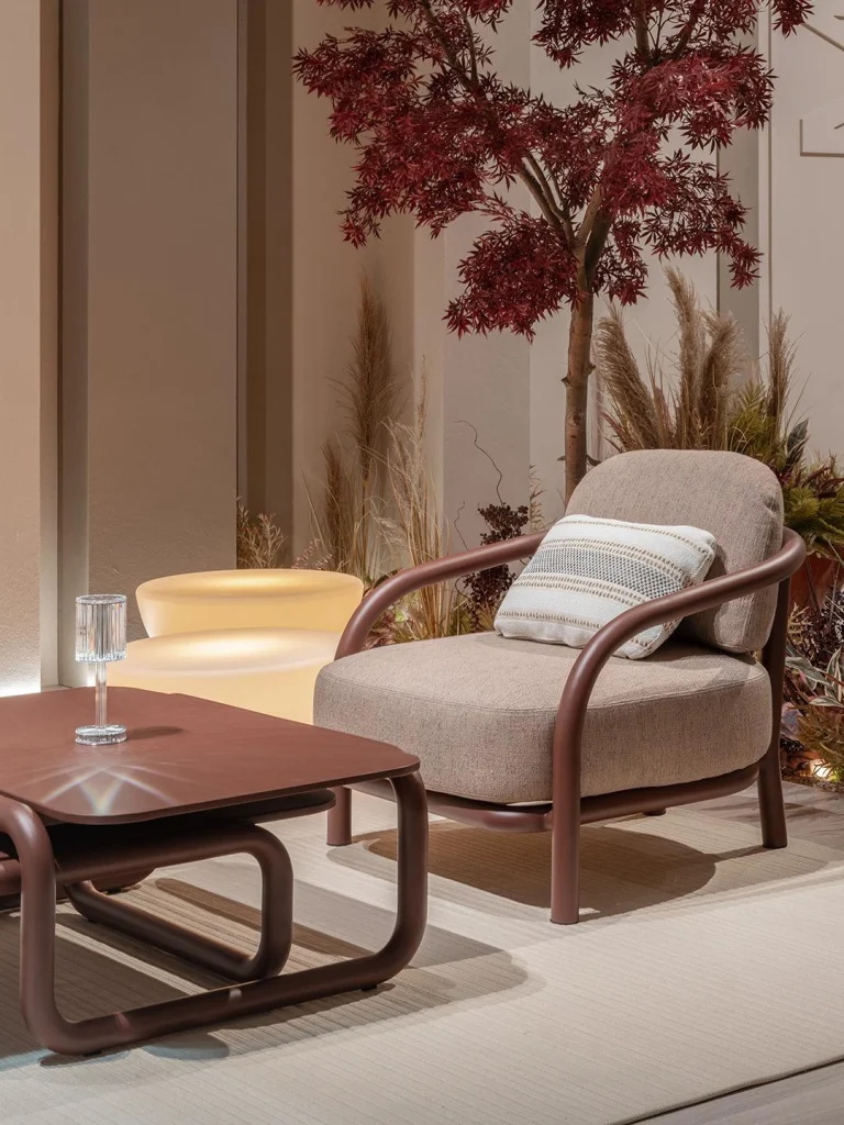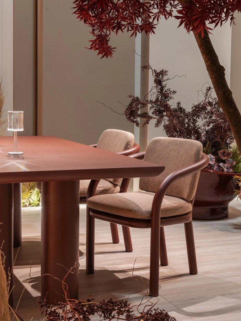 Gum propone una lectura más contenida y geométrica. Una línea tubular continua dibuja el gesto esencial que envuelve y sostiene cada pieza, estableciendo un diálogo entre estructura y confort. La calidez del tapizado y la pureza formal de las mesas generan una elegancia atemporal situada entre la arquitectura y el paisaje.