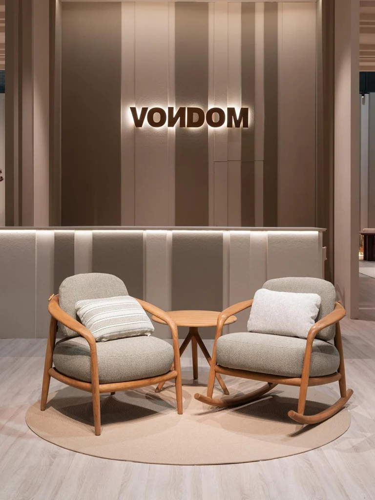 En el stand de Vondom, ubicado en Hall 24, Stand D20, el estudio participó con tres colecciones diseñadas por Ramón Esteve: Fusta, Mel y Gum. Además, Ramón Esteve, como director creativo de Vondom, colaboró en el diseño del espacio expositivo, concebido como una arquitectura contenida que no compite con las piezas, sino que las acompaña.